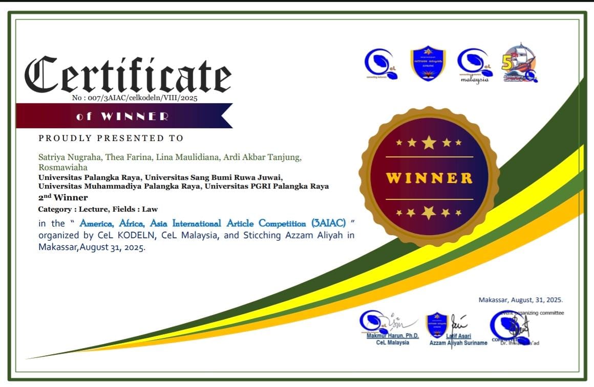 PALANGKA RAYA – Dekan Fakultas Hukum (FH) Universitas Muhammadiyah Palangka Raya (UMPR), Ardi Akbar Tanjung, SH, MH. berhasil meraih prestasi gemilang dengan menjadi Juara 2 dalam The America, Africa, Asia International Article Competition (3AIAC). Lomba ini diikuti oleh Cel Kodeln, Cel Malaysia, dan Sticching Azzam Aliyah di Makassar pada 31 Agustus 2025.